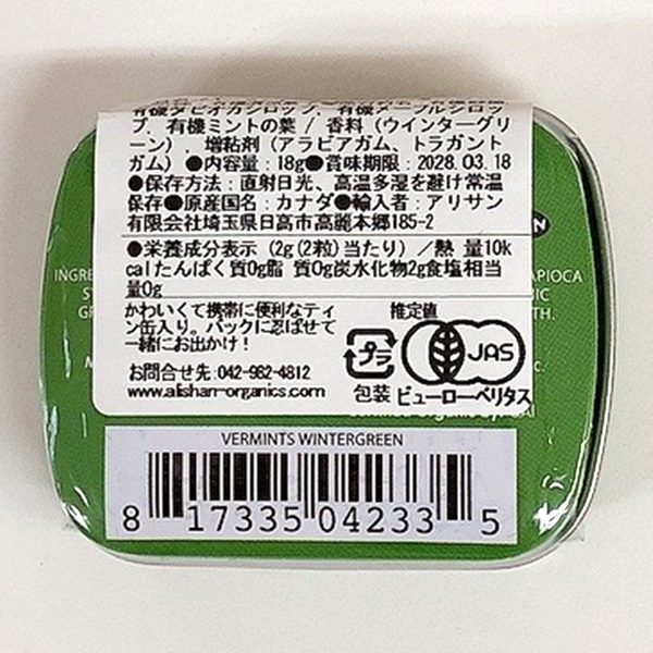 可愛いパッケージで携帯に便利な缶入りです。アメリカでよく知られているミントの一種・ウインターグリーンの風味、動物性のものは使っていません。グルテンフリー、ナッツフリー、コーシャー認定。有機JAS認定品。