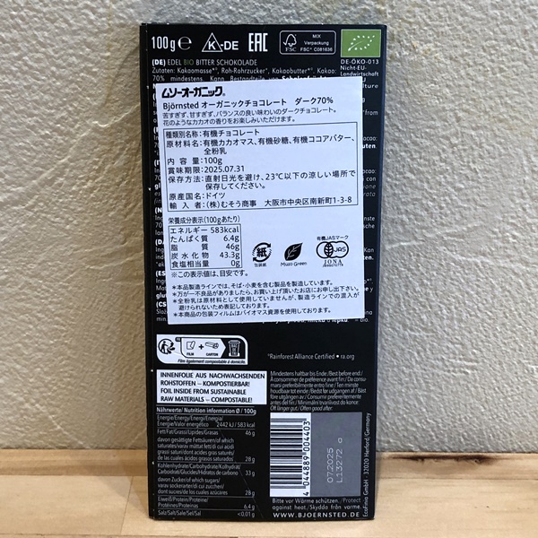 bjornsted (ビヨンステッド)オーガニックチョコレート・ダーク70%は、有機JAS認定のオーガニック食品です。ドイツの老舗チョコレートメーカーが作ったオーガニックの「Bean to Bar」チョコレートです。