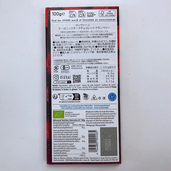 00年以上の長い歴史を誇るドイツのチョコレートメーカーです。ビターな味わいと、滑らかな食感が特徴のチョコレートに細かく刻んだクランベリーの実を加えました。ヴィーガン対応、有機JAS認定商品、11月~3月の限定品なので早い者勝ちです。