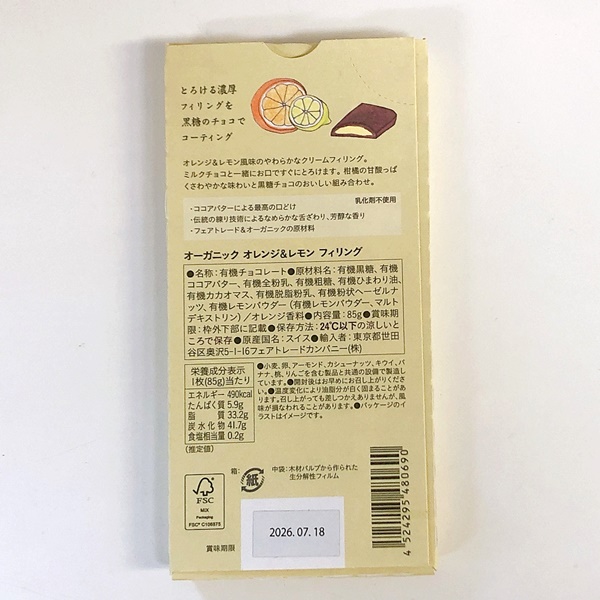 【原材料】有機黒糖, 有機ココアバター, 有機全粉乳, 有機粗糖, 有機ひまわり油, 有機カカオマス, 有機脱脂粉乳, 有機粉状ヘーゼルナッツ, 有機レモンパウダー(有機レモンパウダー、マルトデキストリン) / オレンジ香料