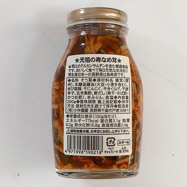 【原材料】榎茸、本醸造醤油、きび粗糖、干にんにく、干きくらげ、干唐辛子、玄米黒酢、素だし、本みりん、食塩