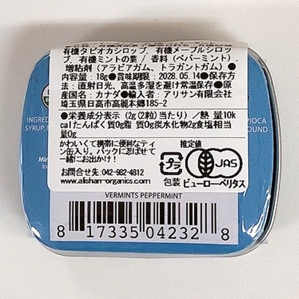 可愛いパッケージで携帯に便利な缶入りです。親しみやすいミント味は、一番人気、動物性のものは使っていません。グルテンフリー、ナッツフリー、コーシャー認定。有機JAS認定品。