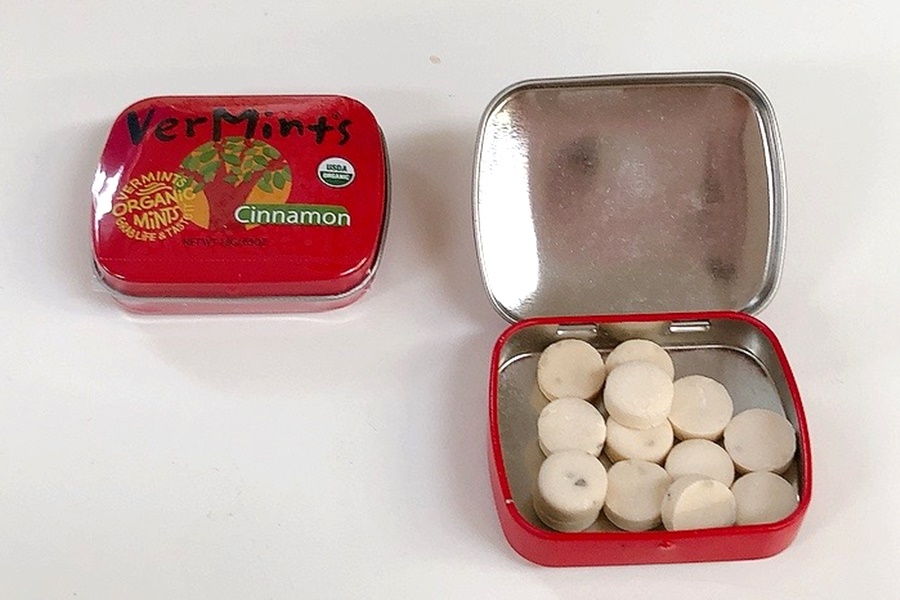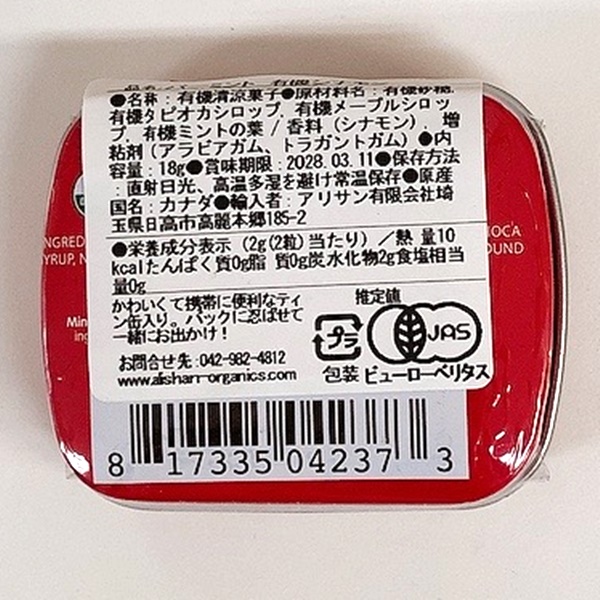 可愛いパッケージで携帯に便利な缶入りです。ミントにシナモンの風味が付いたミント、動物性のものは使っていません。グルテンフリー、ナッツフリー、コーシャー認定。有機JAS認定品。